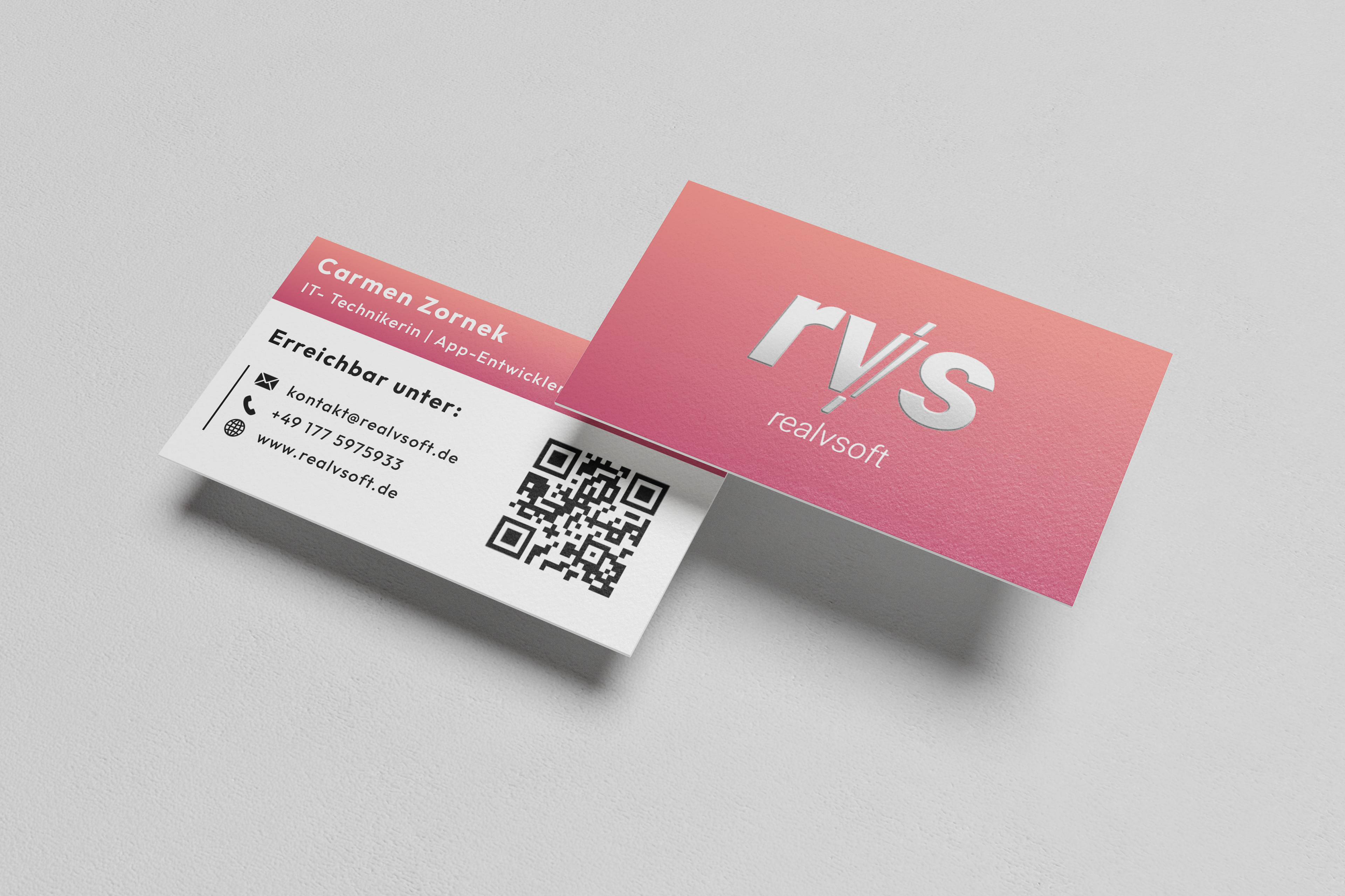 Ich entwickelte das Logo und ein vollständiges Branding-Package für RealVSoft, eine lokale Programmierfirma. Dazu zählten Visitenkarten, Briefpapier und weitere Geschäftsausstattung – gestaltet in einem klaren, modernen Look, der Professionalität und die technische Ausrichtung der Marke konsequent unterstreicht.